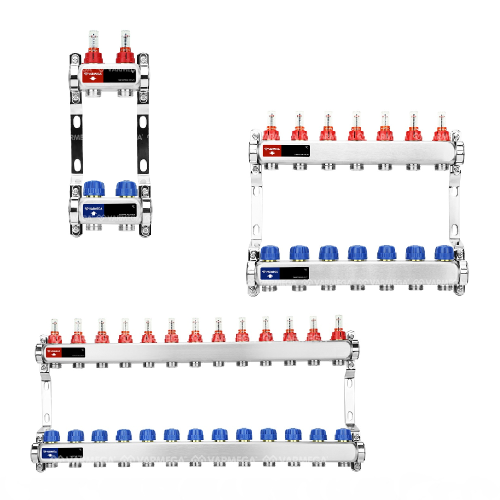 Коллекторные группы предварительной сборки из нержавеющей стали с расходомерами марки Varmega предназначены для распределения и регулирования потоков теплоносителя в низкотемпературных системах отопления (напольное отопление). Оснащены расходомерами на подающем коллекторе и термостатическими вентилями с размером M30x1,5 (с возможностью установки термоэлектрических приводов) на обратном коллекторе.